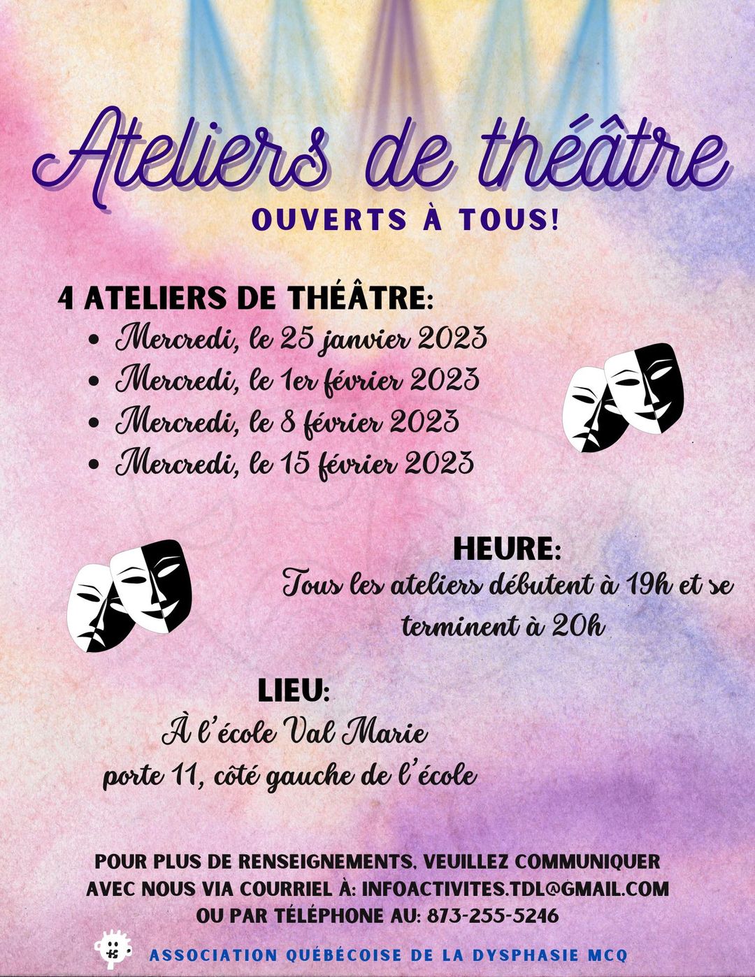 Dans son atelier, l’artiste-enseignant Sébastien Goyette Cournoyer propose une série de quatre cours permettant de s’initier à l’art du théâtre. Par des exercices physiques, individuels et collectifs, les participant.e.s apprendront les étapes importantes liées à la mise en scène comme le jeu d’acteur.trice, la création de personnages, la scénographie et bien plus encore! Nous découvrirons, par le fait même, divers genres dramatiques tels que le drame et la comédie, ce qui permettra aux participant.e.s d’explorer une variété d’émotions, de gestes et d’interprétations!
