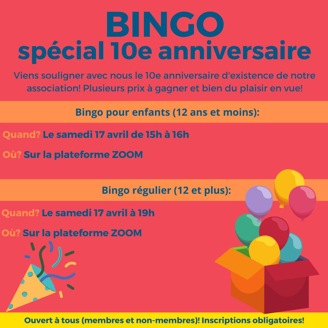 Viens souligner avec nous le 10e anniversaire d’existence de notre association! Plusieurs prix à gagner et beaucoup de plaisir en vue.