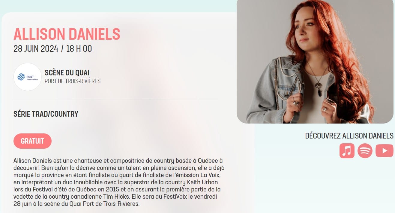 Festivoix: Allison Daniels L'événement est terminé. Date Juin 28 2024 Expired! Heure 17 h 45 min Lieu Port de Trois-Rivières Partagez cet événement