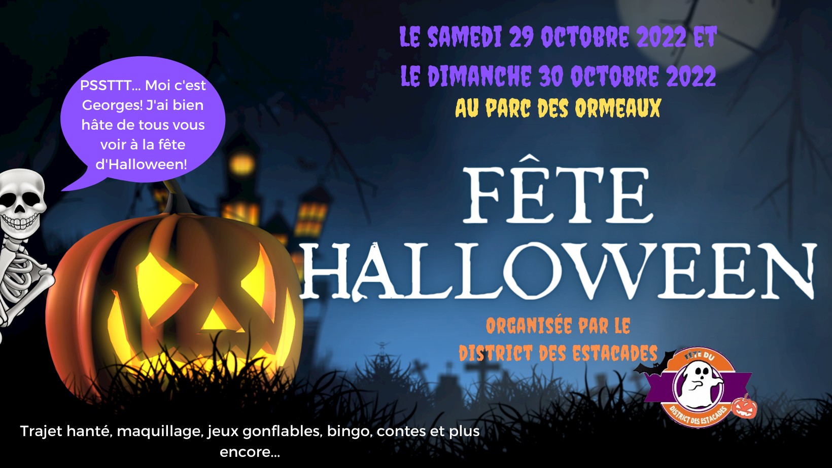 Fête d’Halloween du District des Estacades Cette année, nous avons collaboré avec le comité du district des estacades pour vous organisez une belle fête d’Halloween. L'événement est terminé. Date Oct 29 2022 Expired! Heure All Day Lieu Parc des Ormeaux Organisateur District des Estacades Partagez cet événement Laisser un commentaire Annuler la réponseVotre adresse e-mail ne sera pas publiée. Les champs obligatoires sont indiqués avec *Commentaire * Nom E-mail Site web Notice: It seems you have Javascript disabled in your Browser. In order to submit a comment to this post, please write this code along with your comment: a93b1f46e37951b08c137cfd0596d16a Tous droits réservés - TDL Mauricie et Centre-du-Québec