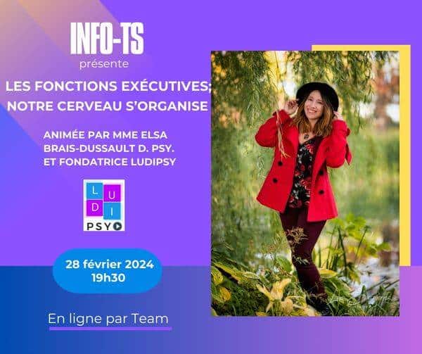 Info TS: Les fonctions exécutives; notre cerveau s’organise L'événement est terminé. Date Fév 28 2024 Expired! Heure 19 h 30 min Lieu Teams Organisateur TDL Québec Partagez cet événement