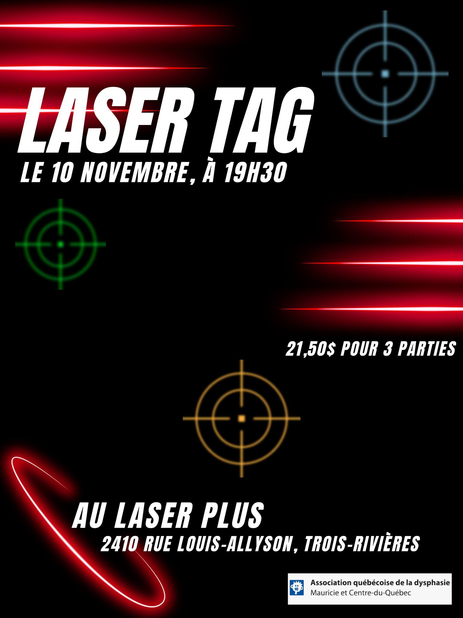 Laser Tag L'événement est terminé. Date Nov 10 2023 Expired! Heure 19 h 30 min Lieu Laser PLus 2410 Rue Louis-Allyson, Trois-Rivières Organisateur Dysphasie MCQ Partagez cet événement