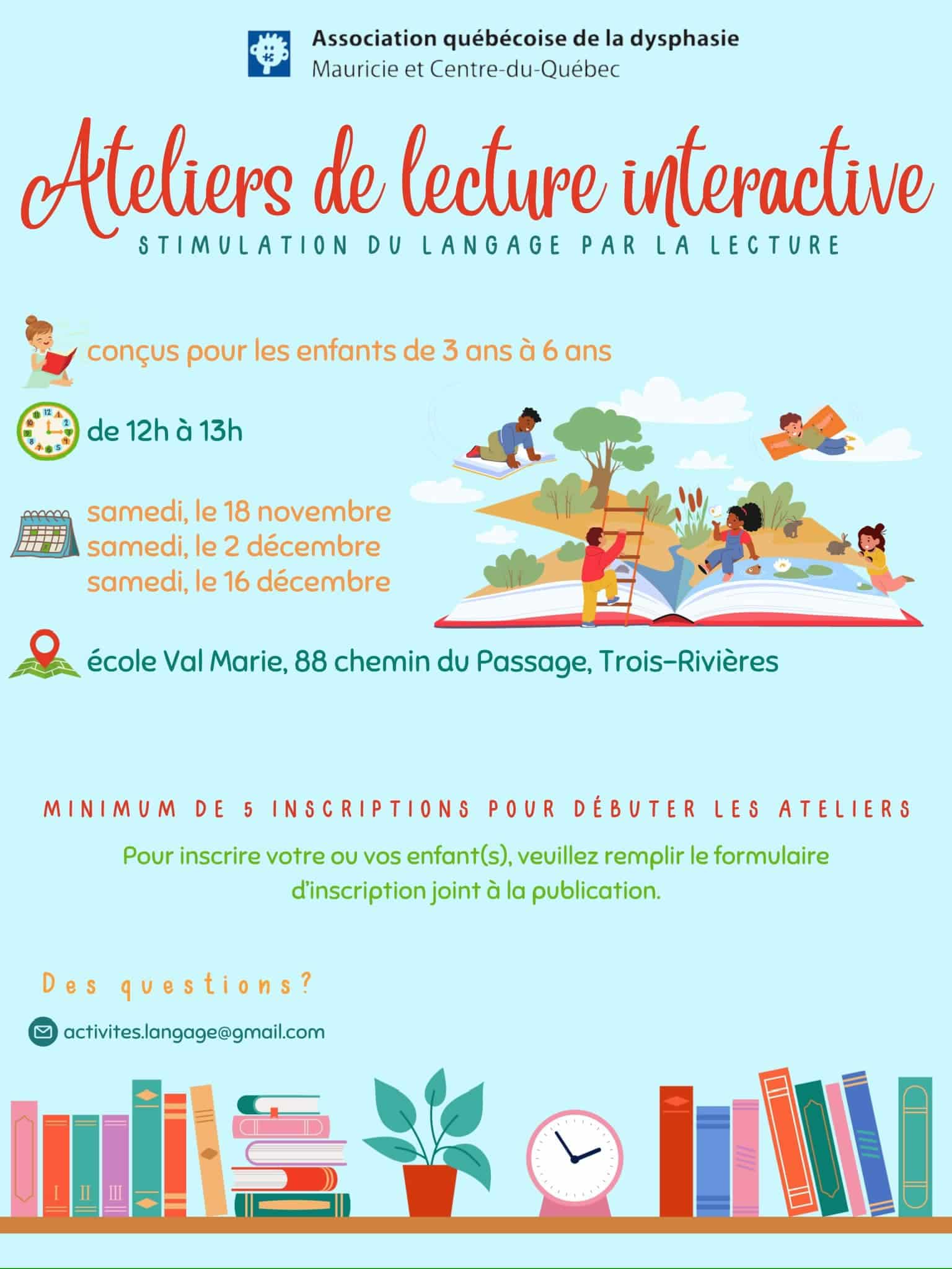 Lecture interactive L'événement est terminé. Date Nov 18 2023 Expired! Heure 12 h 00 min - 13 h 00 min Lieu École Val Marie Organisateur Dysphasie MCQ Partagez cet événement