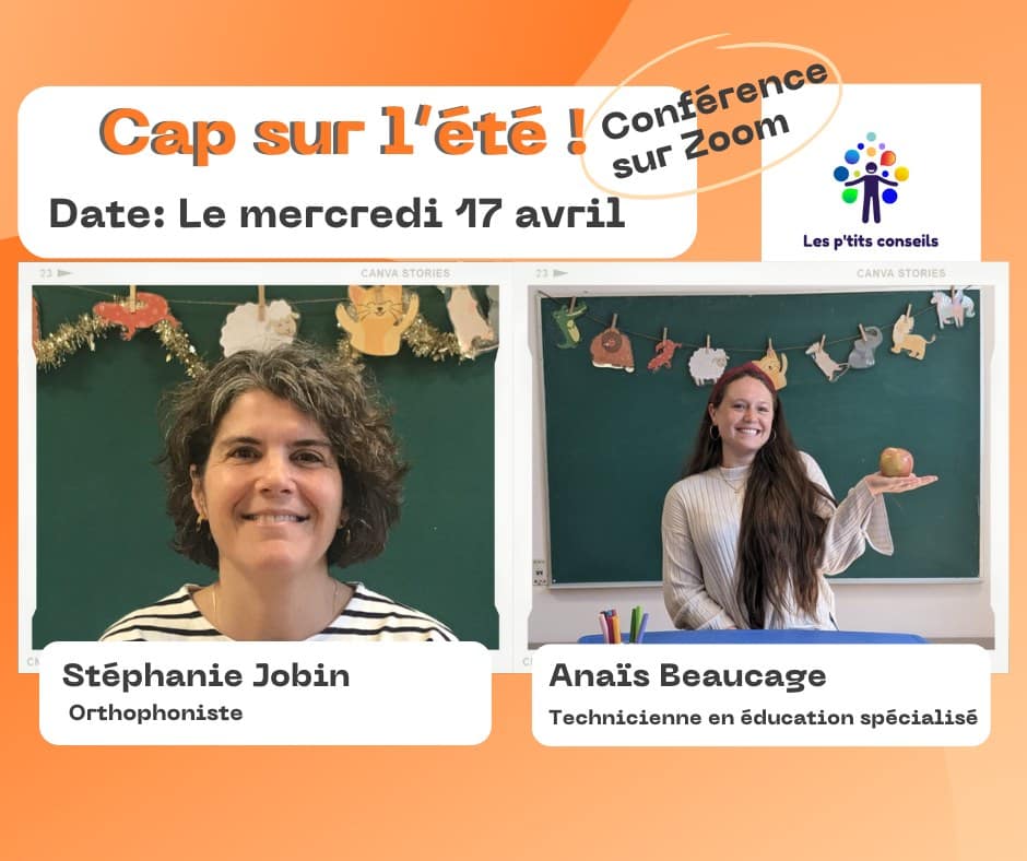 Ce mercredi 17 avril de 19h30 à 21h sur Zoom, Anaïs Beaucage, TES, et Stéphanie Jobin, orthophoniste, nous présentent la conférence : Cap sur l’été !