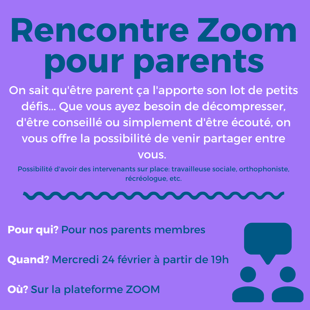 On sait qu’être parent apporte son lot de petits défis… Que vous ayez besoin de décompresser, d’être conseillé ou simplement d’être écouté, on vous offre la possibilité de venir partager entre vous.