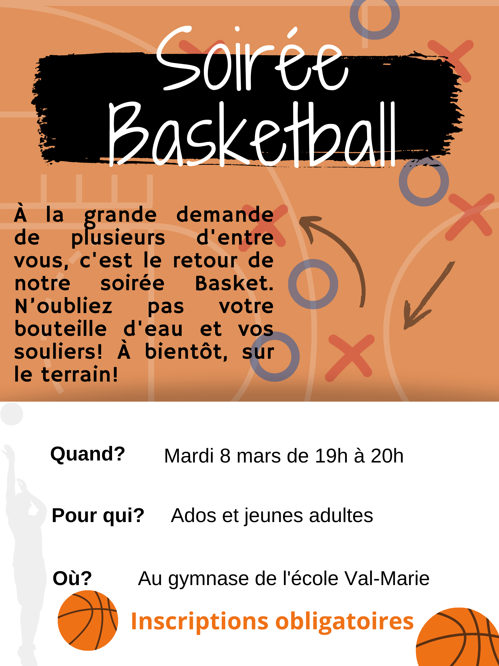 Soirée Basketball Joignez-vous à nous pour une petite partie de Basket-Ball! L'événement est terminé. Date Mar 08 2022 Expired! Heure 19 h 00 min - 20 h 00 min Lieu École Val Marie Organisateur Carolane Leclerc Partagez cet événement