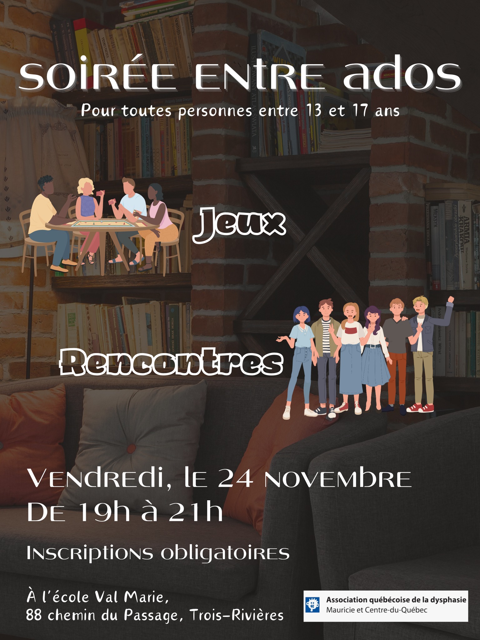 Soirée entre ados Pour tous les jeunes de 13 à 17 ans. Joignez-vous à nous pour une belle soirée! L'événement est terminé. Date Nov 24 2023 Expired! Heure 19 h 00 min - 21 h 00 min Lieu École Val Marie Organisateur Dysphasie MCQ Partagez cet événement