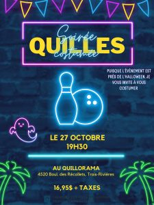 Soirée quilles costumée L'événement est terminé. Date Oct 27 2023 Expired! Heure 19 h 30 min Organisateur Dysphasie MCQ Partagez cet événement
